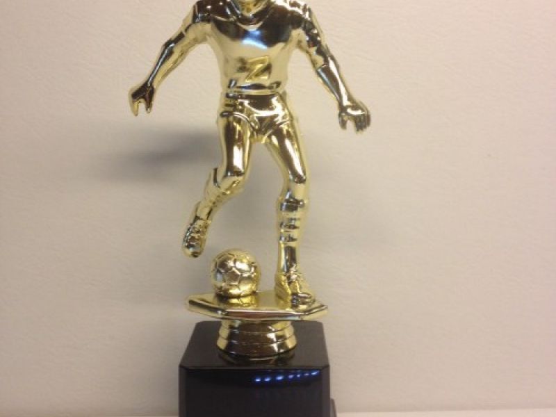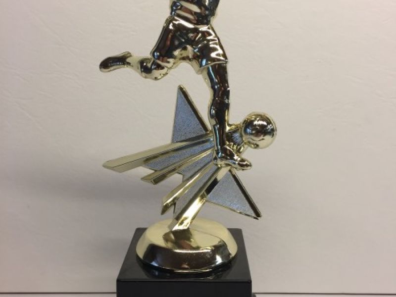 Flot trofæ hvor du får fodbold figur oven på toppen af en stor fod.